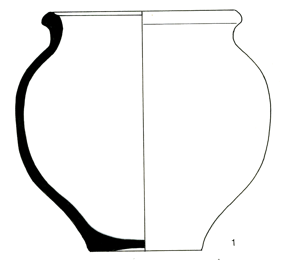 Pot de forme sphérique ; encolure verticale, concave, rebord épaissi à l'extérieur, lèvre concave ; base étirée, assise concave ; céramique tournée, pâte de couleur brune, noire en surface ; inclusions grossières : quartz irrégulier, mica ; surface brute.