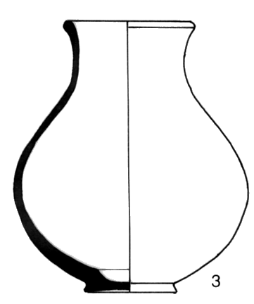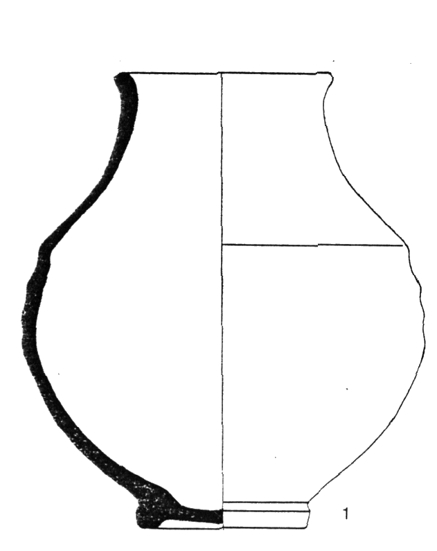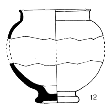 Pot de forme sphérique ; encolure rentrante, rectiligne, lèvre convexe ; base étirée, assise plane ; céramique tournée, pâte de couleur grise, noire en surface ; inclusions moyennes : quartz ; surface brute.