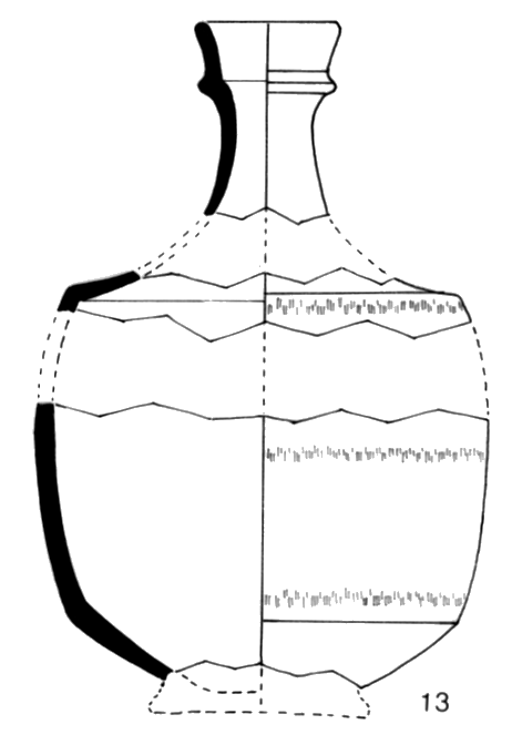 Bouteille aux parois divergentes rectilignes en bas, puis verticales convexes ; encolure rentrante, concave, rebord en parement, lèvre ronde ; céramique tournée, pâte de couleur noire, orangée en surface ; inclusions fines : quartz irrégulier en proportion moyenne, mica ; surface avec couverte rouge. Lignes guillochées en haut, au milieu et au bas de la panse.