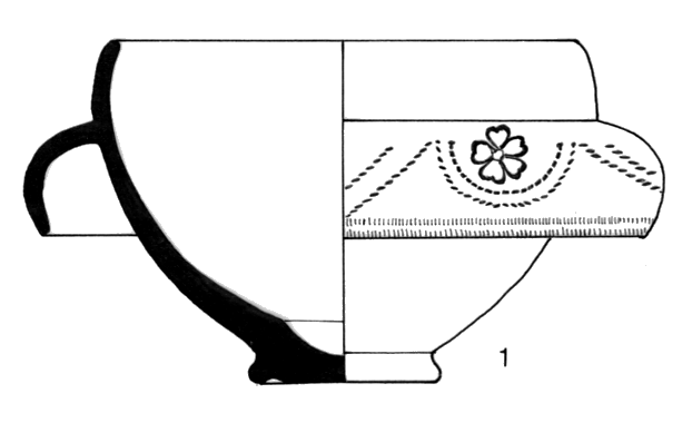 Bol de forme hémisphérique ; lèvre ronde ; base étirée puis élargie, assise tournée ; collerette s'attachant sur le haut de la panse ; céramique tournée, pâte de couleur brune, noire en surface ; inclusions fines : quartz régulier en proportion moyenne, mica ; surface avec couverte. Décor impressionné sur la collerette.
