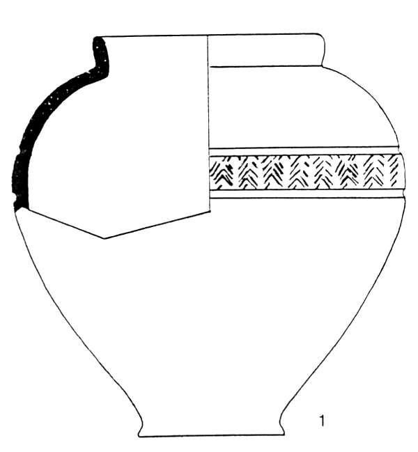 Pot de forme ovoide ; encolure verticale, rectiligne, lèvre ronde ; base étirée puis élargie, assise plane ; céramique tournée, pâte de couleur jaunâtre, grise en surface ; inclusions fines : quartz irrégulier en proportion moyenne ; surface engobée. Zone ornée à la molette limitée par deux sillons sur le milieu de la panse.