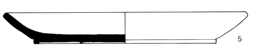 Plat aux parois divergentes rectilignes ; lèvre convexe ; base annulaire, assise avec anneau porteur ; céramique tournée, pâte de couleur noire, jaunâtre en surface ; inclusions fines : quartz régulier en proportion moyenne, mica ; surface avec couverte rouge. Zone guillochée sur le fond.