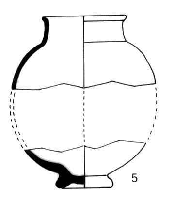 Pot à panse sphérique ; encolure rentrante concave, lèvre ronde ; base éargie avec une assise concave. Céramique tournée, pâte couleur jaunâtre, grise en surface ; inclusions moyennes : quartz irrégulier en proportion moyenne, mica ; surface engobée.