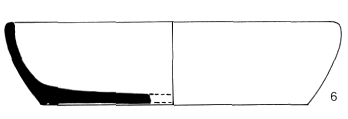 Bol aux parois divergentes rectilignes en bas, puis verticales rectilignes ; rebord incliné vers l'extérieur, lèvre ronde ; base étirée, assise concave ; céramique tournée, pâte de couleur noire, orangée en surface ; inclusions grossières : quartz en proportion moyenne, mica ; surface brute.