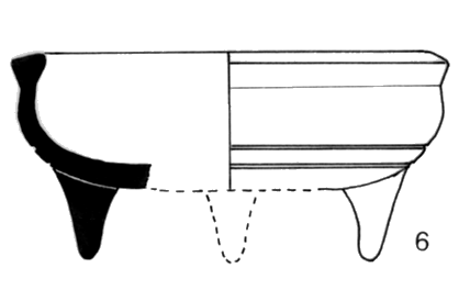 Marmite-tripode de forme hémisphérique ; rebord épaissi à l'intérieur, lèvre plate ; pieds coniques verticaux ; céramique tournée, pâte de couleur grise, orangée en surface ; inclusions grossières : quartz ; surface brute. Deux sillons au bas de la panse, près de l'attache des pieds.